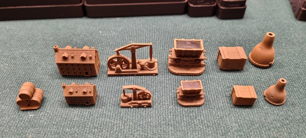 These buildings are smaller than our export tokens and are designed to be placed on the industry tiles. We like have these in our custom container and place the buildings on the tile once it has produced during the game. We find it helps with focusing on what tile hasn't produced. Consists of 11 Breweries, 16 Cotton Buildings, 21 Crates, 16 Coal cars, 9 Stirling Engines, 4 Pottery furnaces.