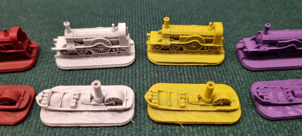 Inspired by the GNR Stirling 4-2-2, and the Charlotte Dundas are these unique industrial age deluxe tokens for Brass Birmingham, printed at 8K in solid resin and painted these tokens will be sure to impress. Absolute gorgeous detail for these tokens. Hand painted in quality hobby paint that matches close to the game colours, and then sealed with a matt sealant to protect them. These tokens brighten up the board whilst still providing the darkened theme of the industrial revolution. Each pack takes us considerable time to produce, printing, washing, removing external supports, painting and sealing.