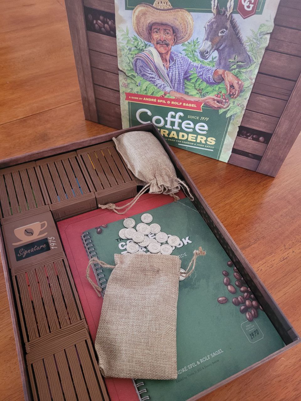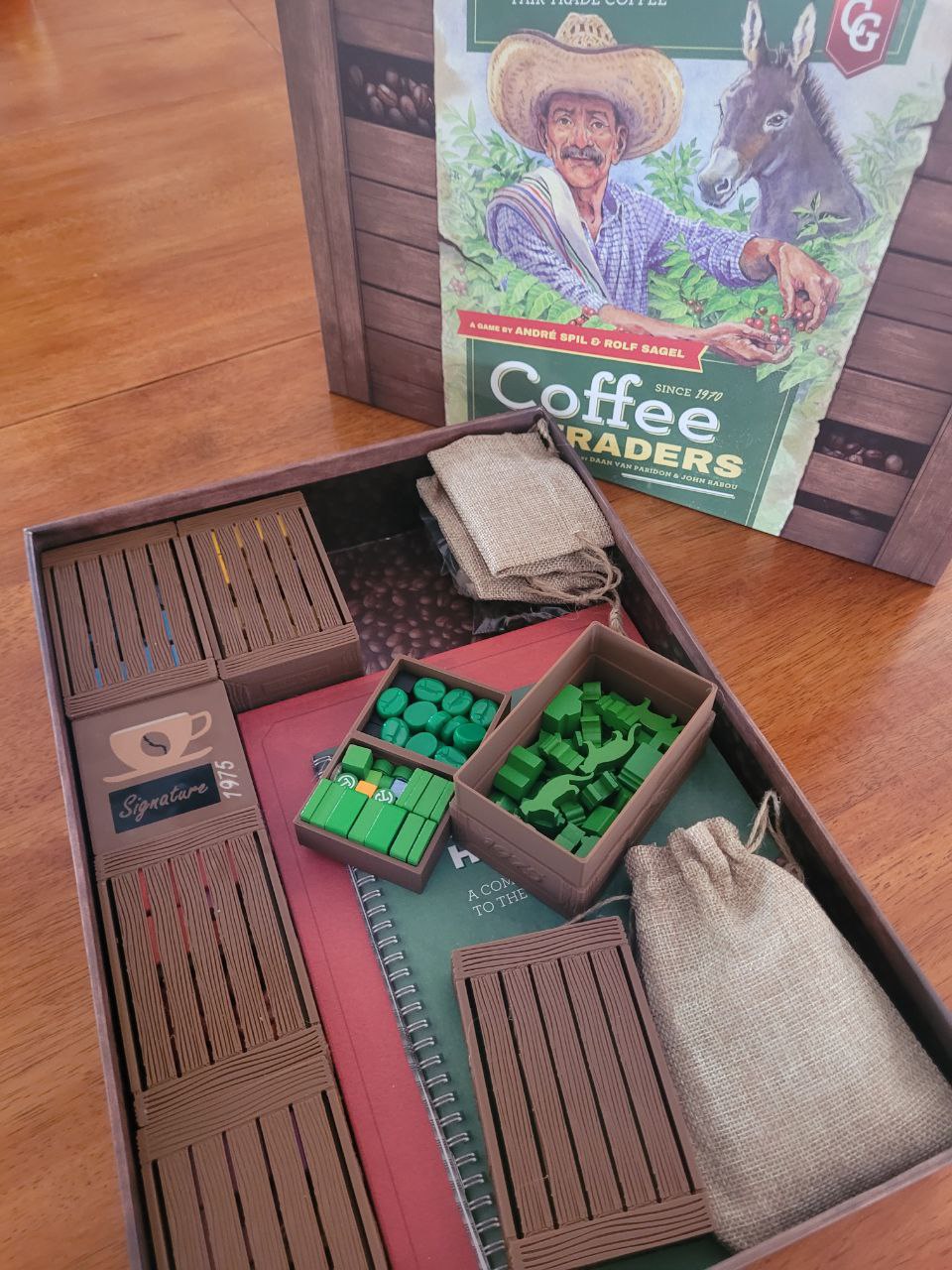 This organiser holds true to our artistic style by utilising export coffee crates to hold all player pieces neatly together. Each export crate can be handed to each player. All contracts tiles and objectives are stored in the Signature Contracts Coffee Box, ready for signing and export. We then have nice quality hessian coffee bags to hold the metal coins, and another to hold all animal and cardboard arabica tokens.