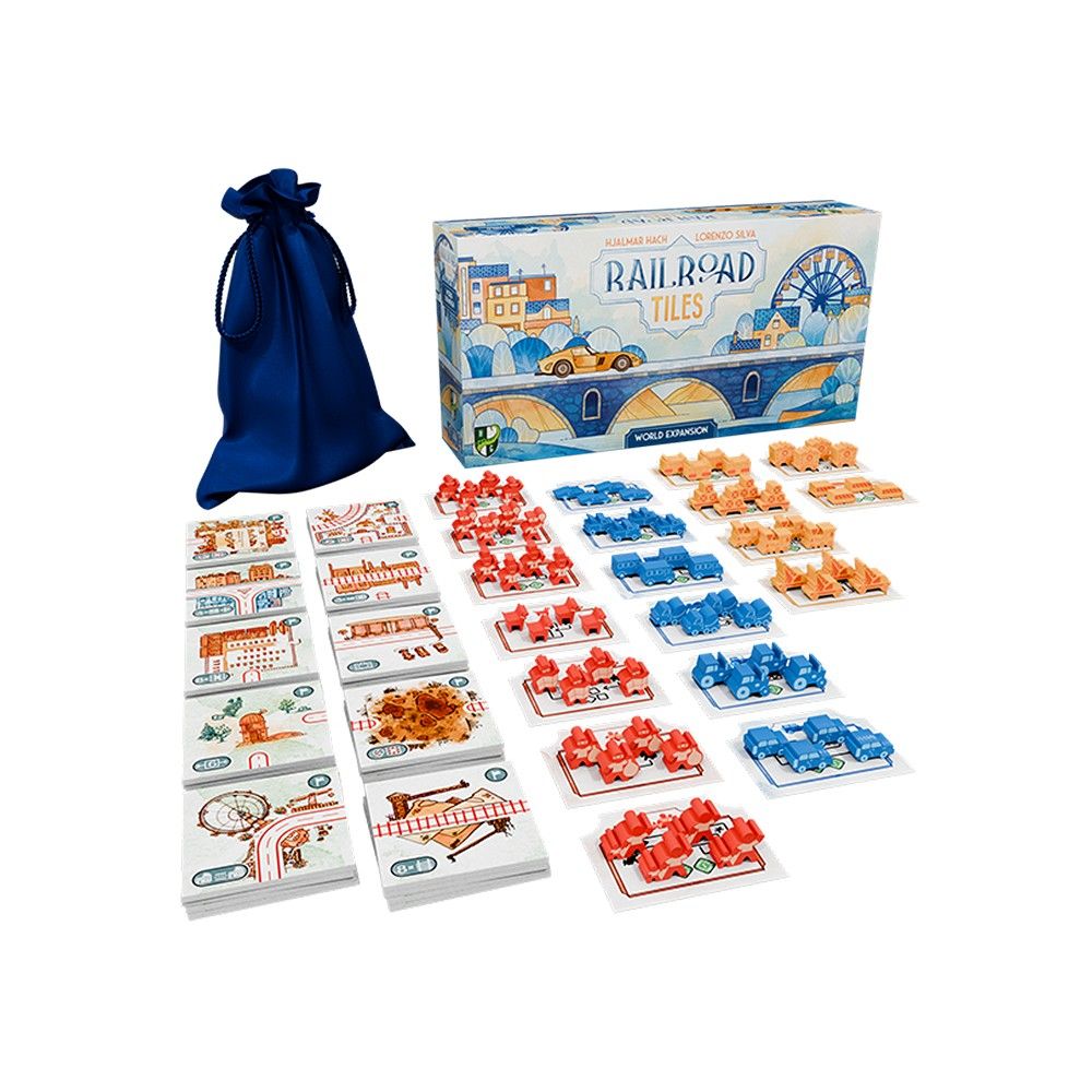 An expansion pack for Railroad Tiles, a sequel to the roll-and-write series Railroad Ink, is a quick-playing tile placement game in which you pick tiles and place routes to build an interconnected community. Add a variety of cars, trains, and travelers to your transportation network!