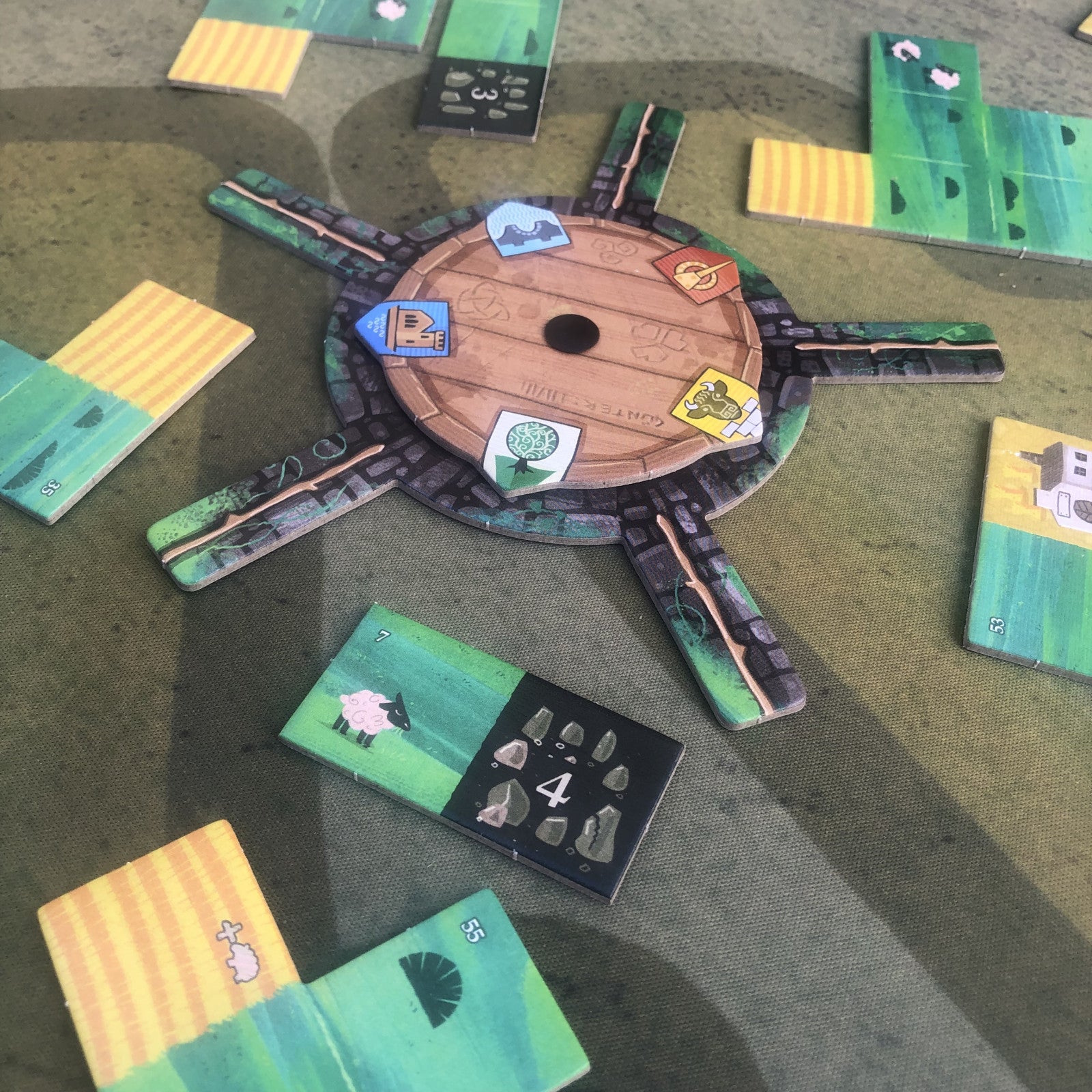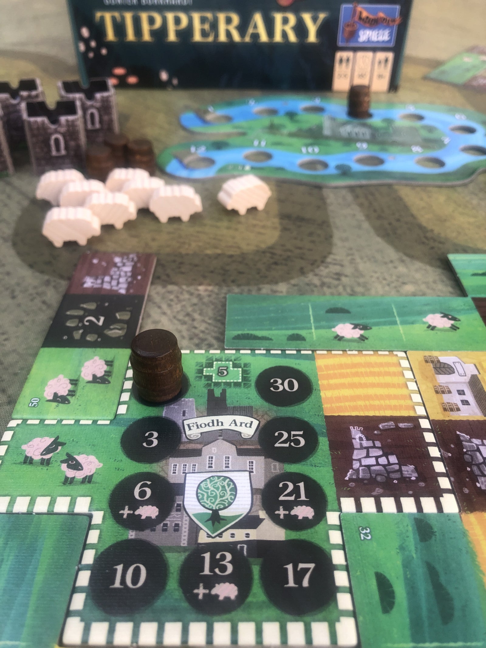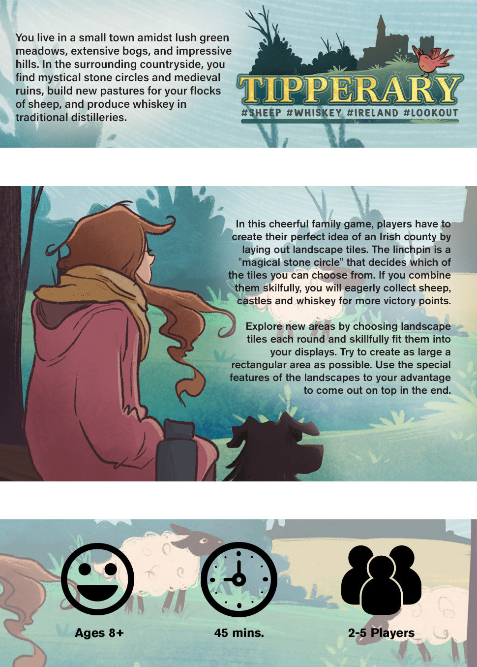 In the tile-laying family game Tipperary, players are challenged to create their perfect vision of an Irish county by placing polyominoes and thus collecting sheep, castles and whiskey. The linchpin is a 'magical stone circle", that decides which of the tiles you can choose from. After twelve rounds, one player will be named chief of Tipperary.